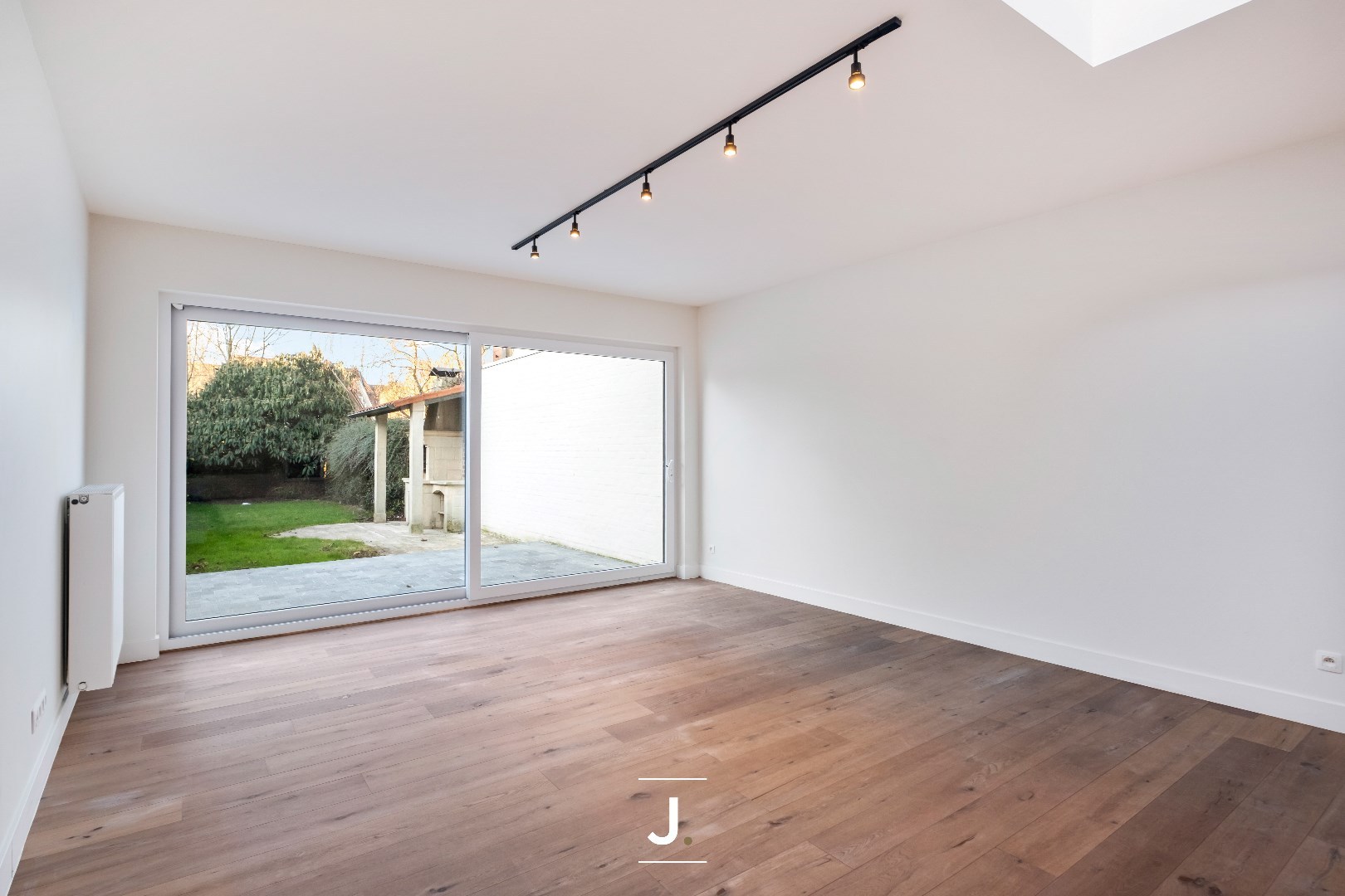 De open leefruimte met veel lichtinval vormt het kloppende hart van de woning. Dankzij de grote raampartijen baadt deze ruimte in natuurlijk licht, wat een luchtige en uitnodigende sfeer creëert.